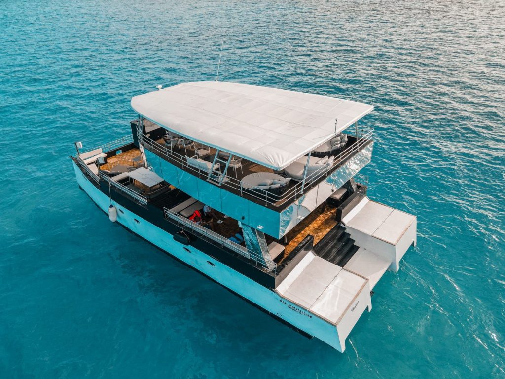 This catamaran comfortably hosts up to 60 guests without feeling crowded. The wide beam creates open social spaces where everyone can move freely, dance, and relax while enjoying the sea breeze.